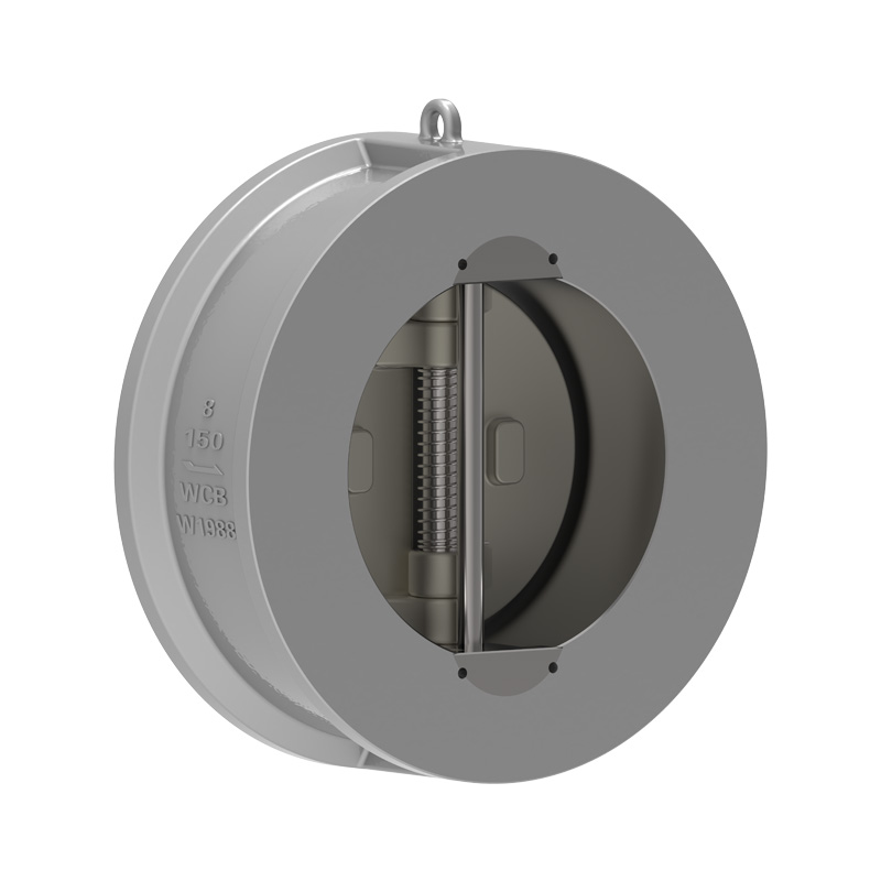 Sommerfuglepladen på den bløde forseglede dobbeltpladekontraventil er to halvcirkler med en fjederbelastet skive ophængt på en central lodret stift.